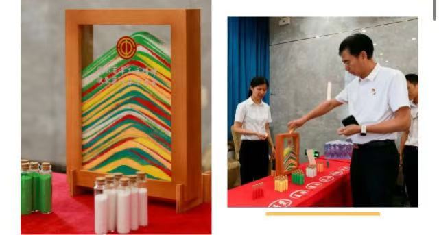 与会人员以流沙画创意签到,每一种砂砾颜色分别寓意着“关爱”“互助”“聚力”“匠心”“创新”和“担当”,每一粒砂砾凝聚成会议主题,寓意职工匠心汇聚、共绘工会发展蓝图。