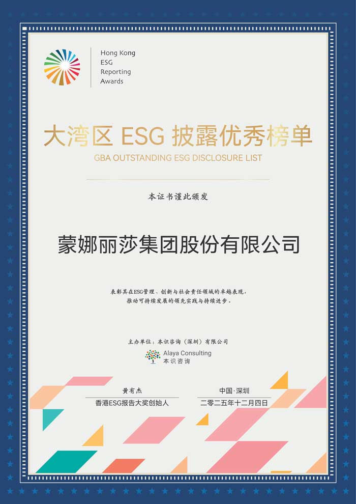 12月4日,大湾区绿色金融与可持续发展高峰论坛在深圳举行。蒙娜丽莎集团入选“大湾区ESG披露优秀榜单”,这是对蒙娜丽莎集团作为上市公司在ESG战略实施、信息披露、创新与社会责任领域等方面实践成果与可持续发展潜力的充分认可。