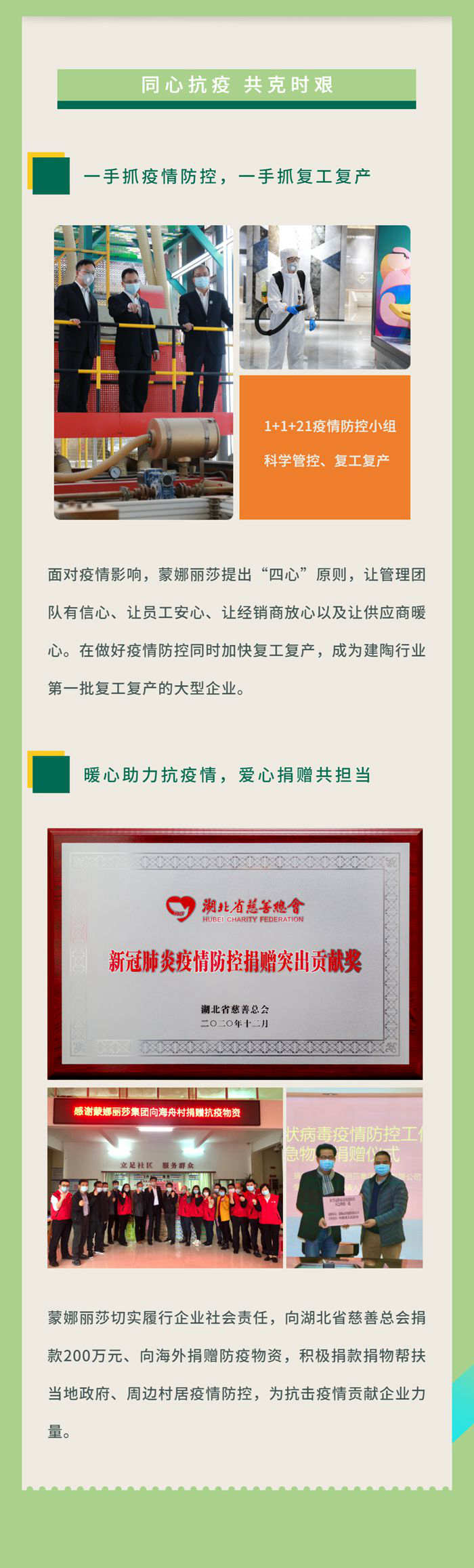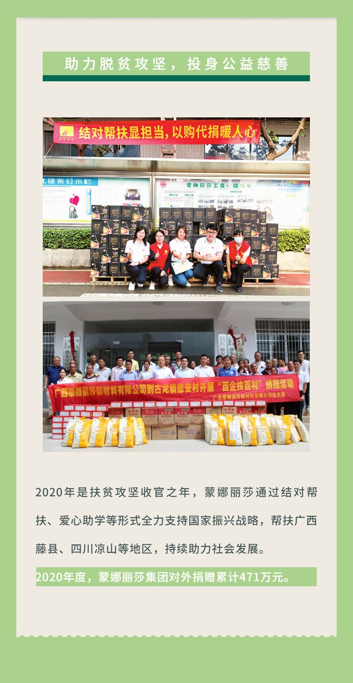2021年4月2日,蒙娜丽莎集团发布了2020年度社会责任报告。这是蒙娜丽莎集团对外发布的第二份社会责任报告。报告从公司发展、公司治理、为社会创造价值、为员工创造价值、奉献社会公益、推动绿色发展等维度,全面介绍了2020年蒙娜丽莎集团在社会责任领域重要举措及成果,展现了蒙娜丽莎集团积极践行企业社会责任的全景图和社会担当。